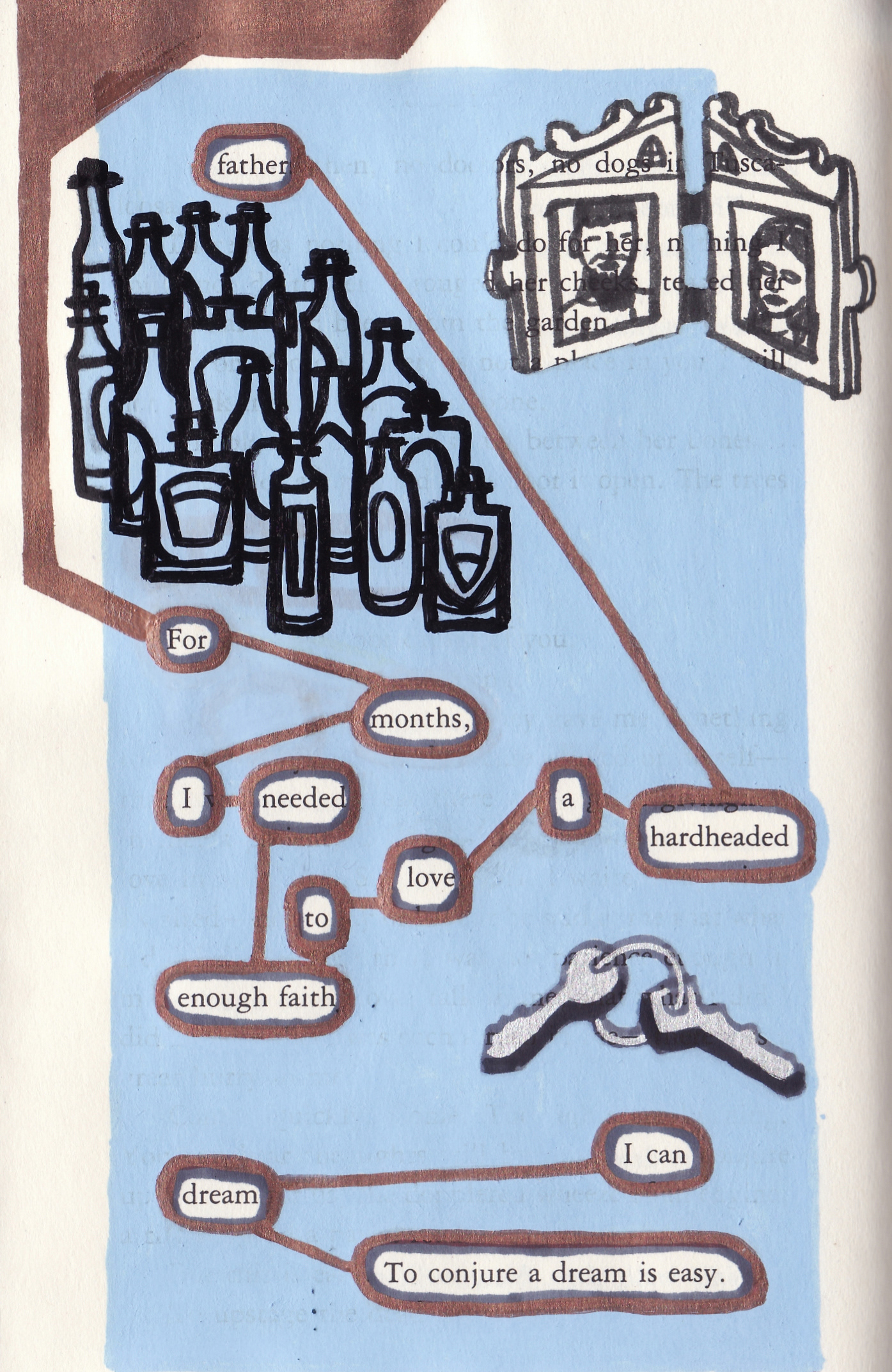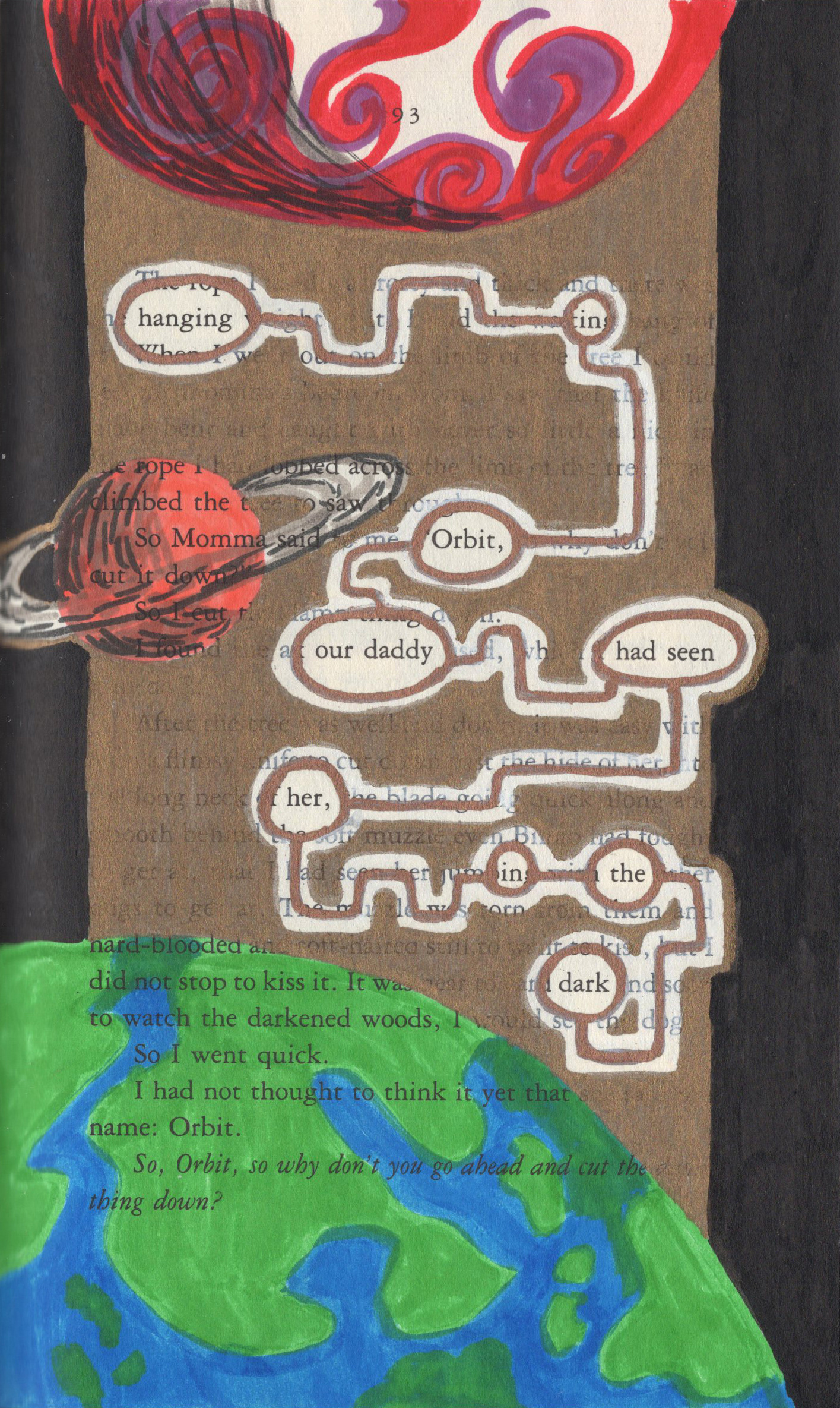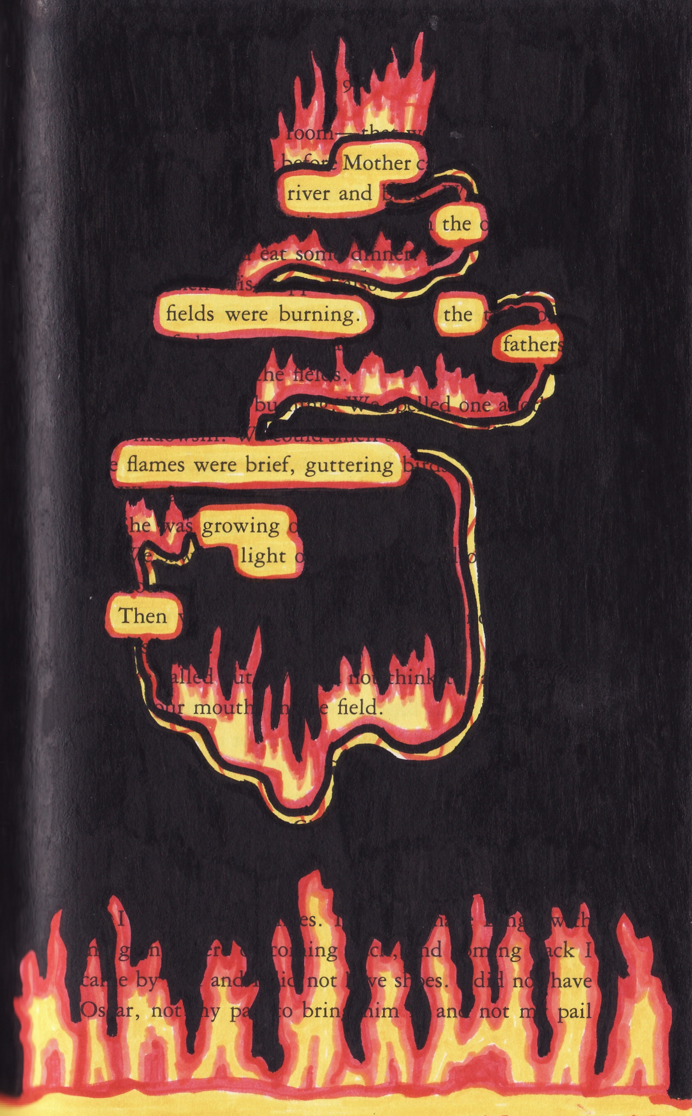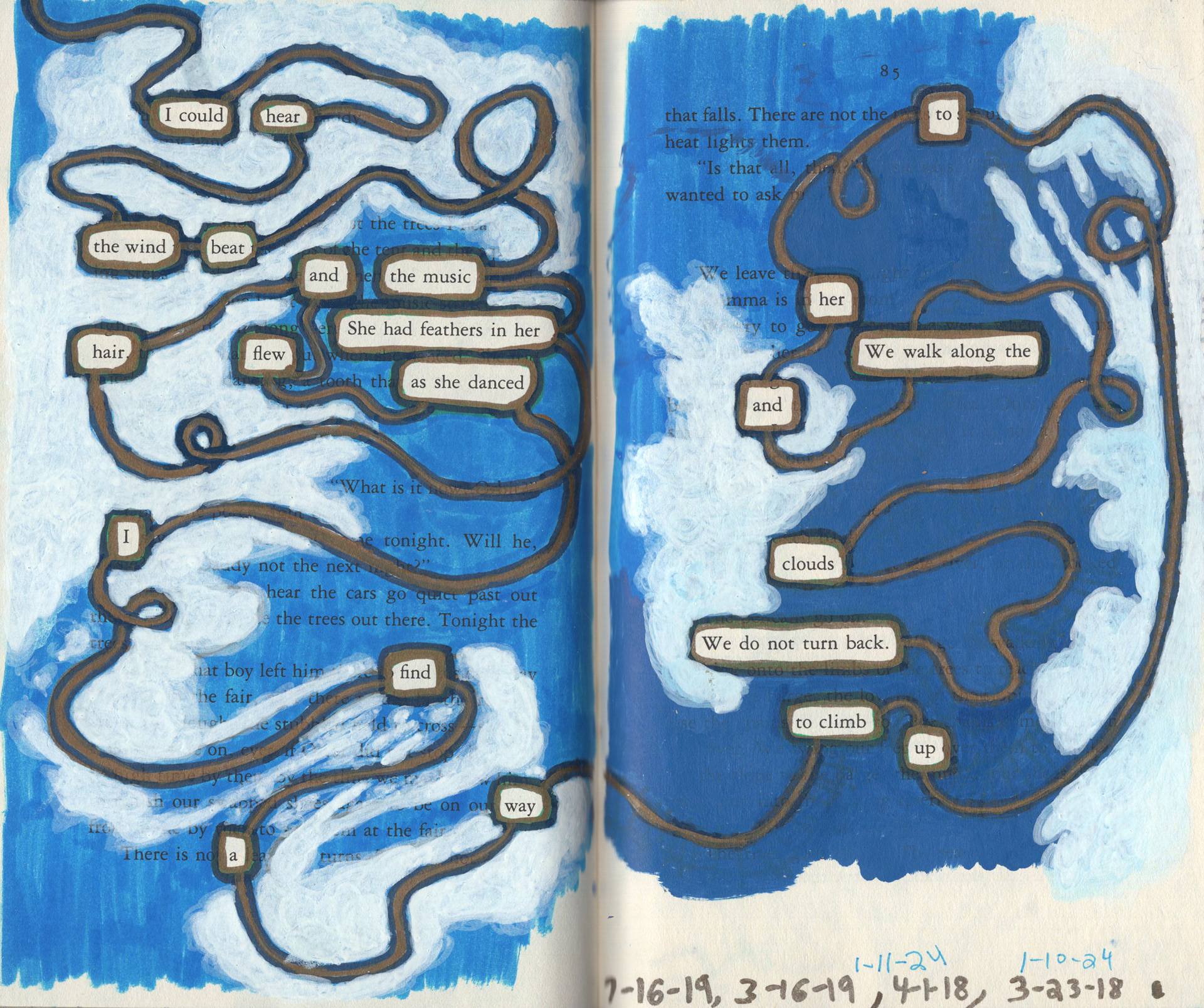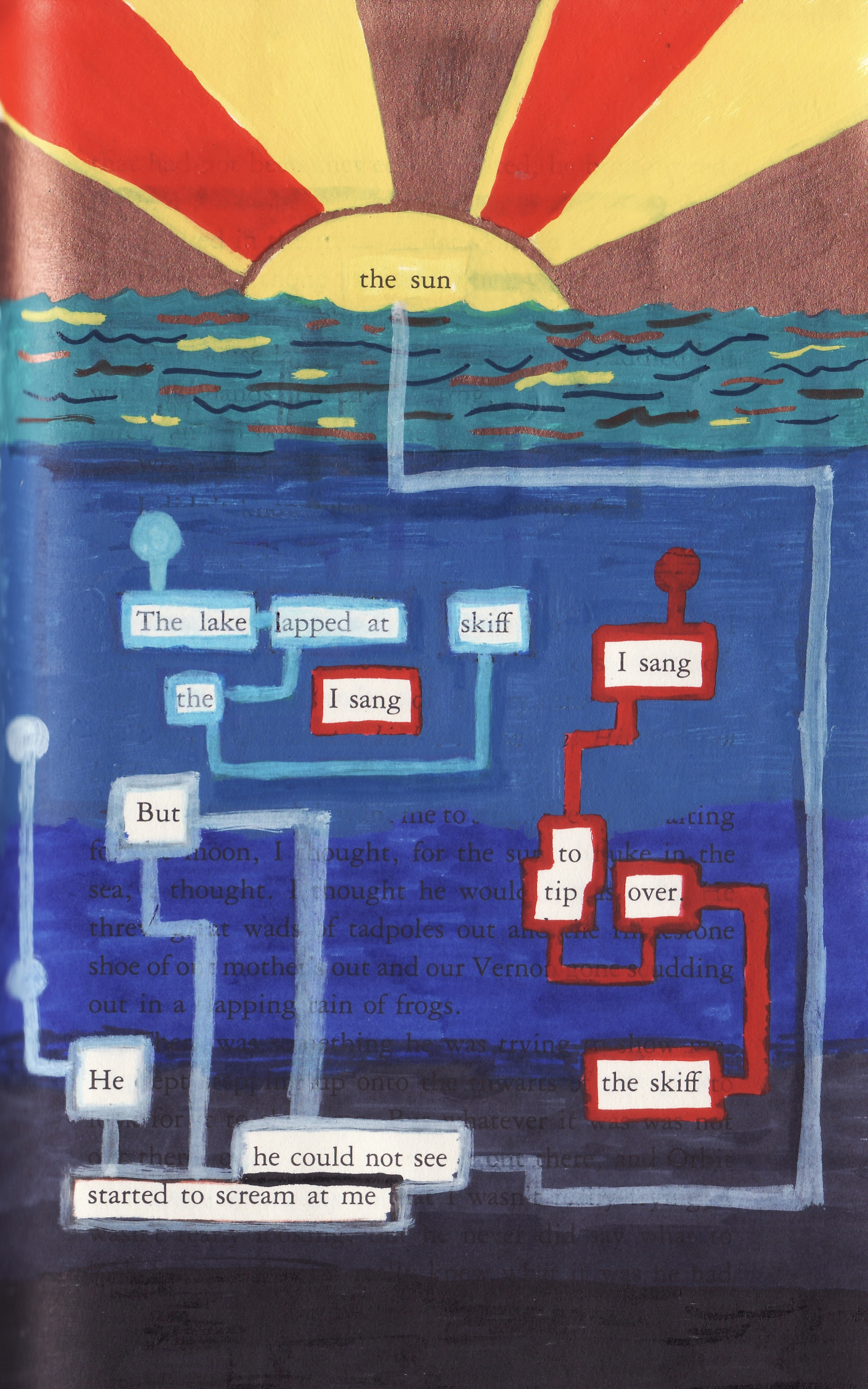 This page is a tricky one and shows that I'm trying to learn how to do altered pages as I go. If viewers only had the image to go on, then I feel like the two sentences in white could be read two ways, either: "He screamed at me, but he could not see the sun," or, "But he could not see the sun. He screamed at me."