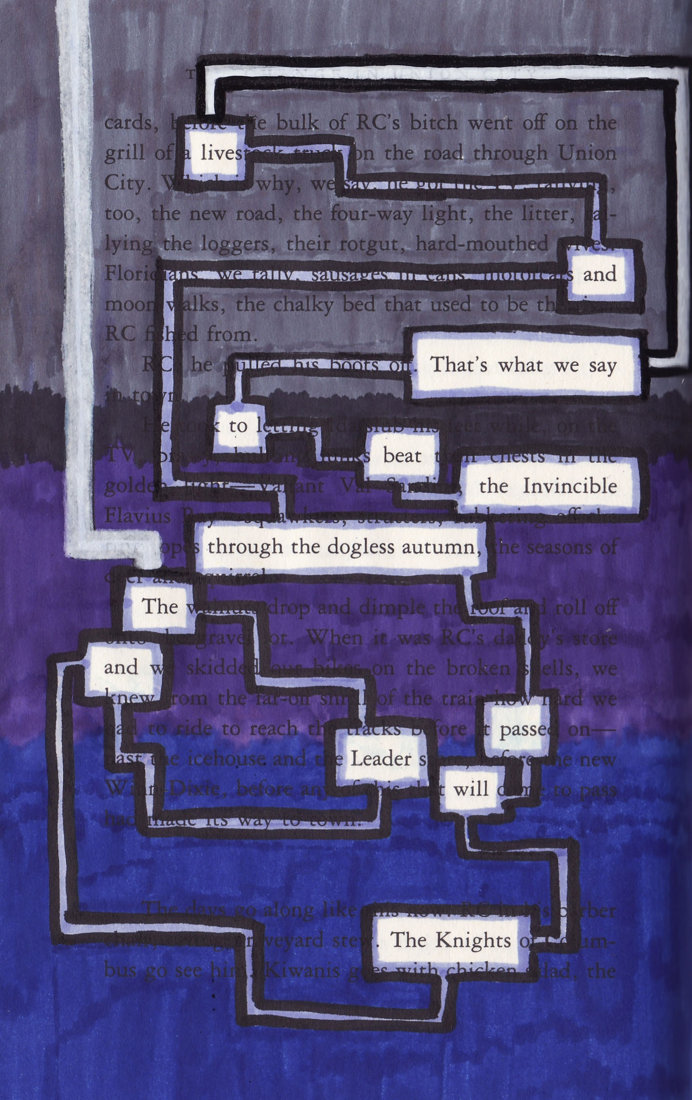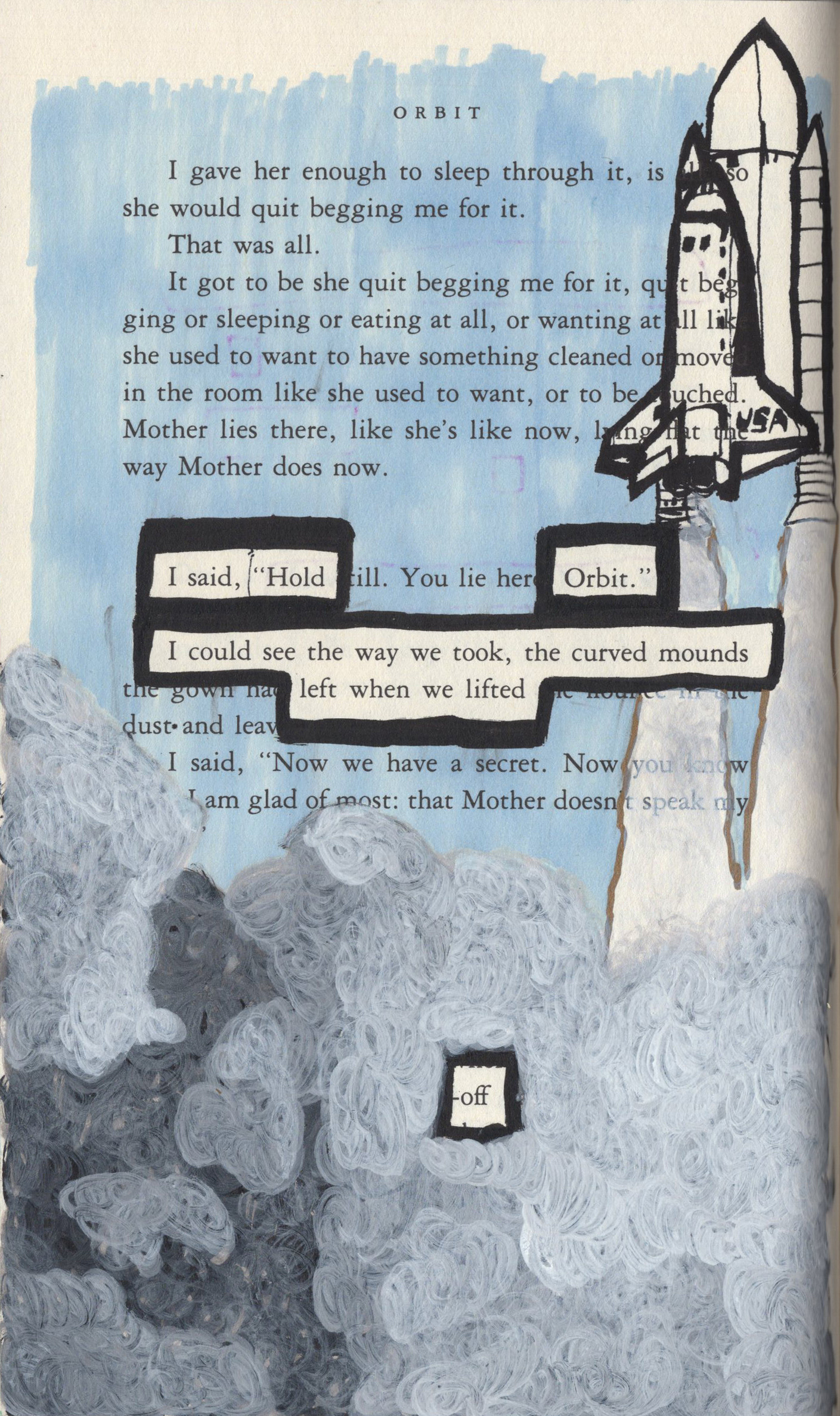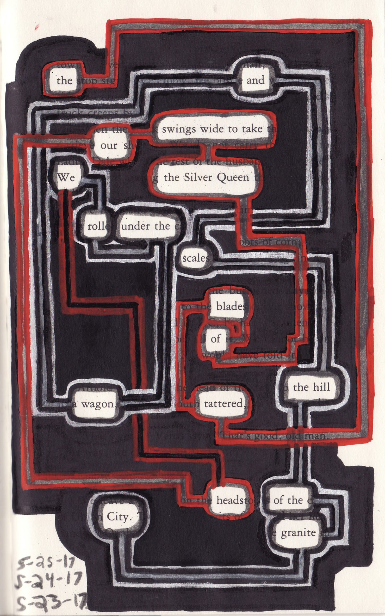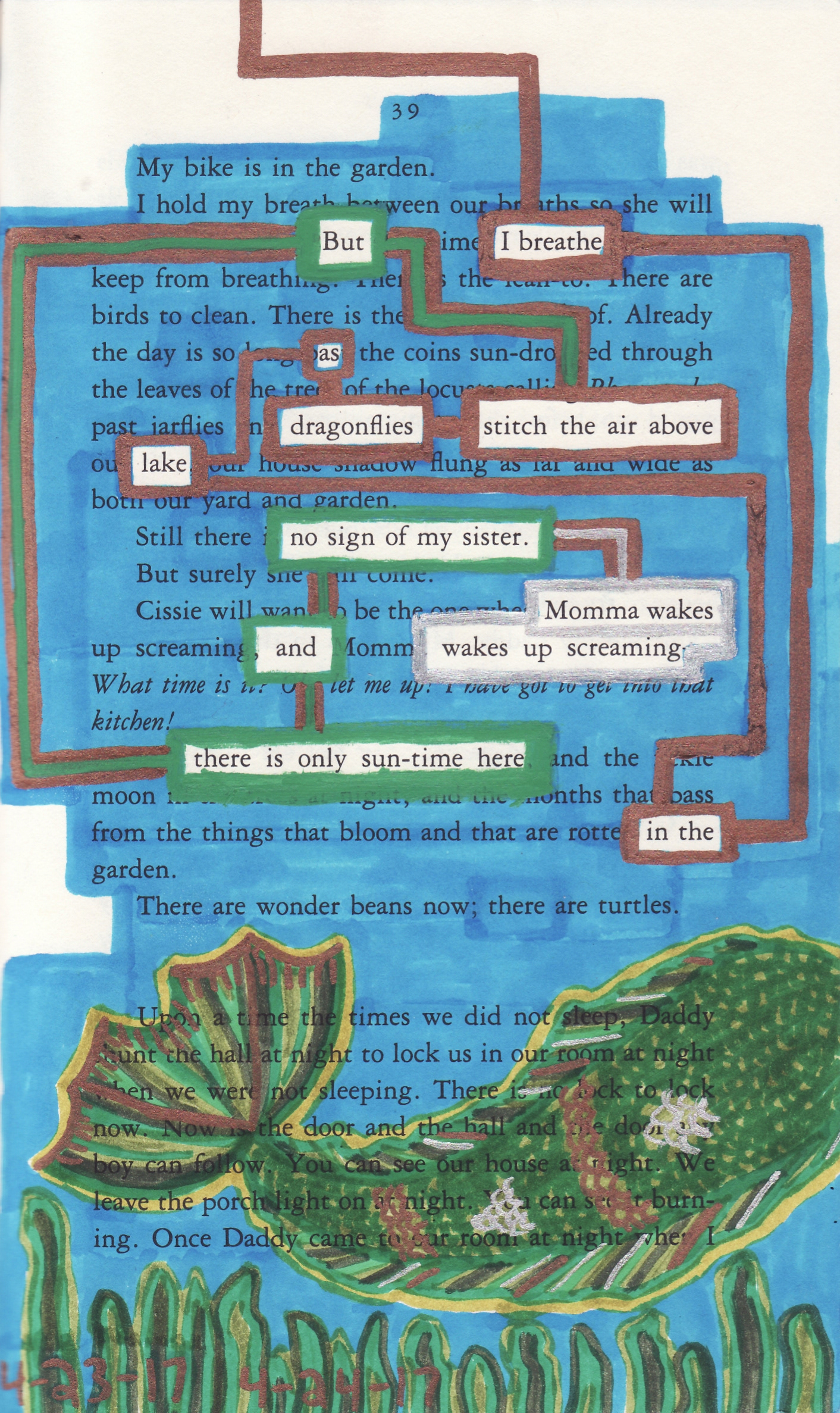This page is a tricky one and shows that I'm trying to learn how to do altered pages as I go. If viewers only had the image to go on, then I feel like the two sentences in white could be read two ways, either: "He screamed at me, but he could not see the sun," or, "But he could not see the sun. He screamed at me."