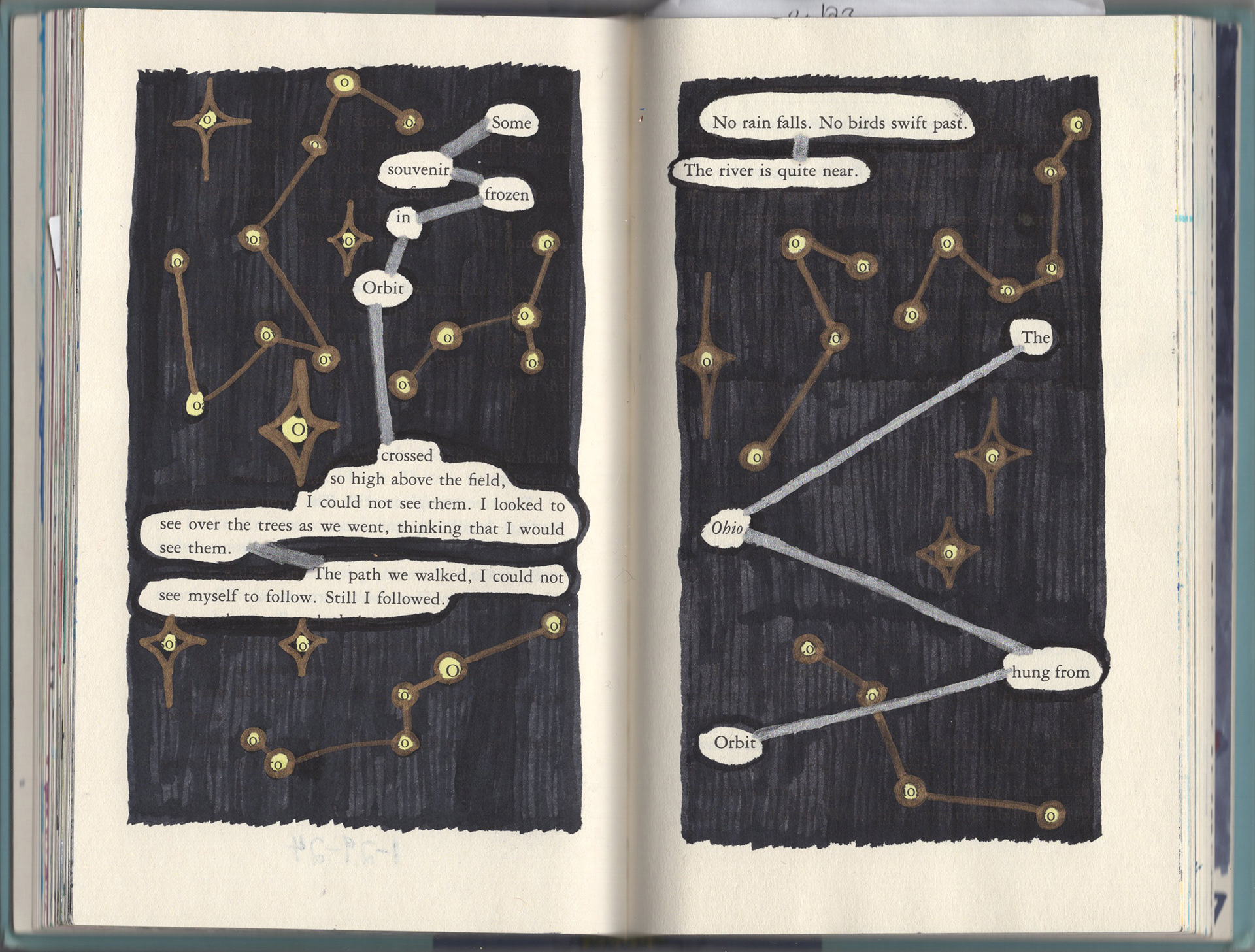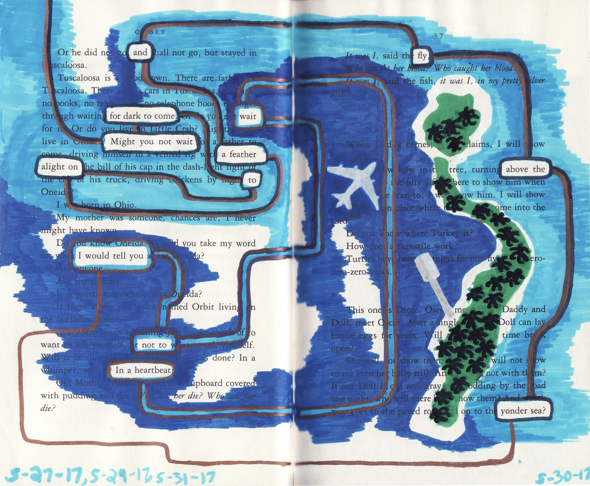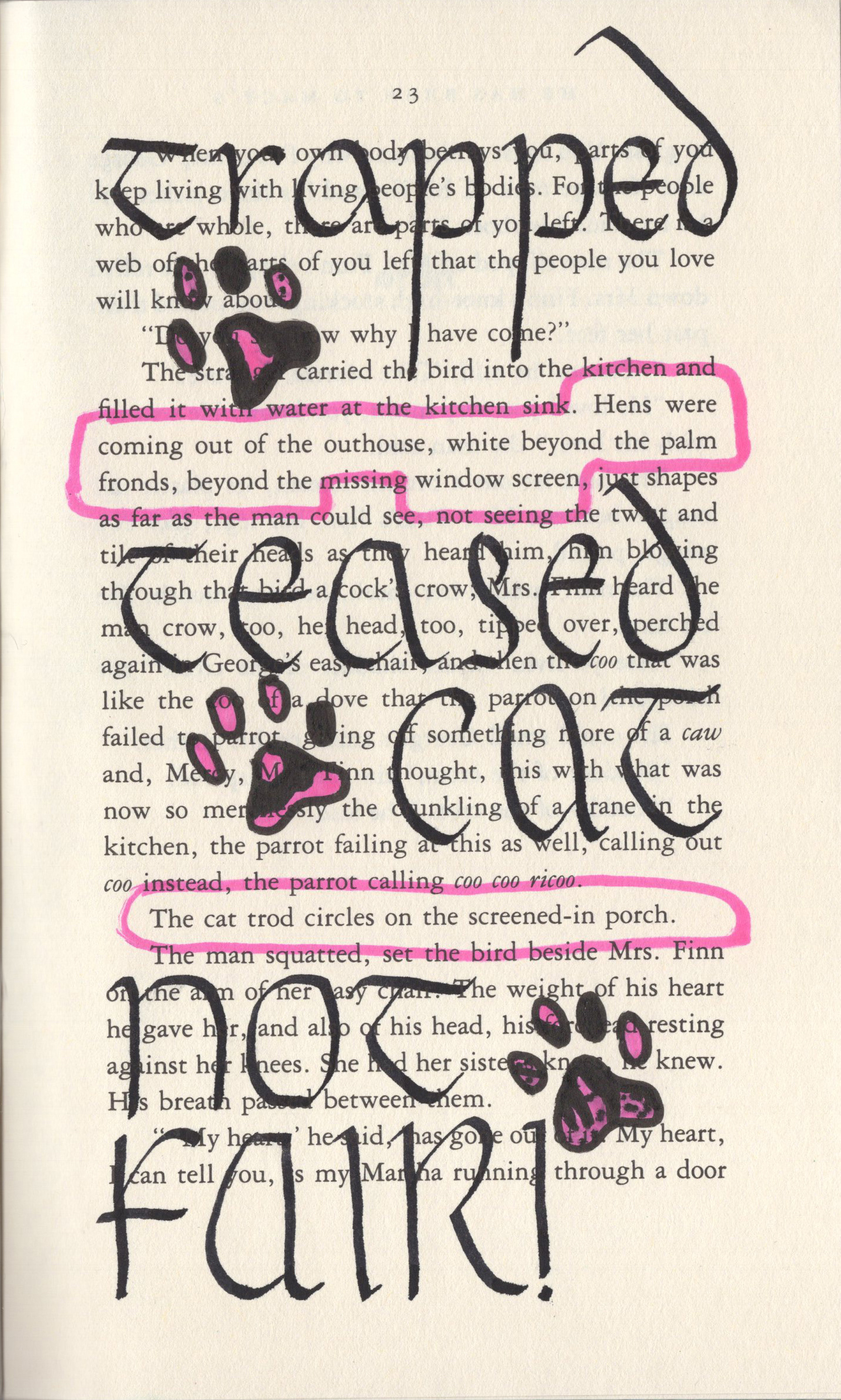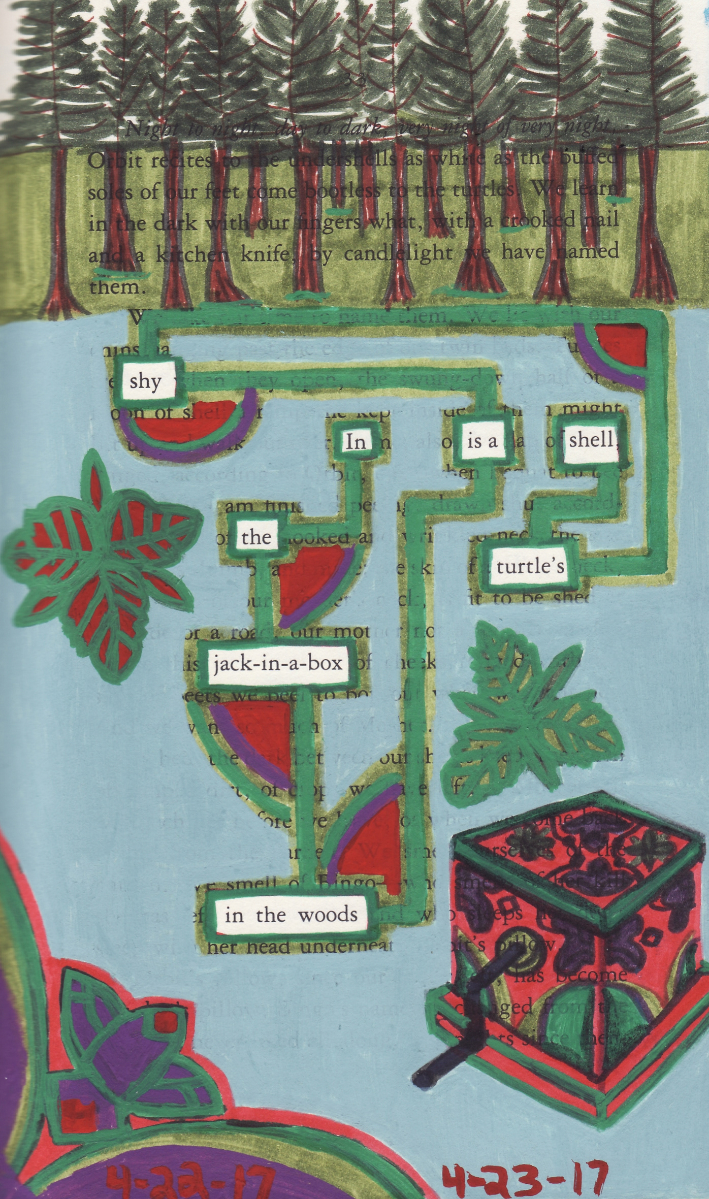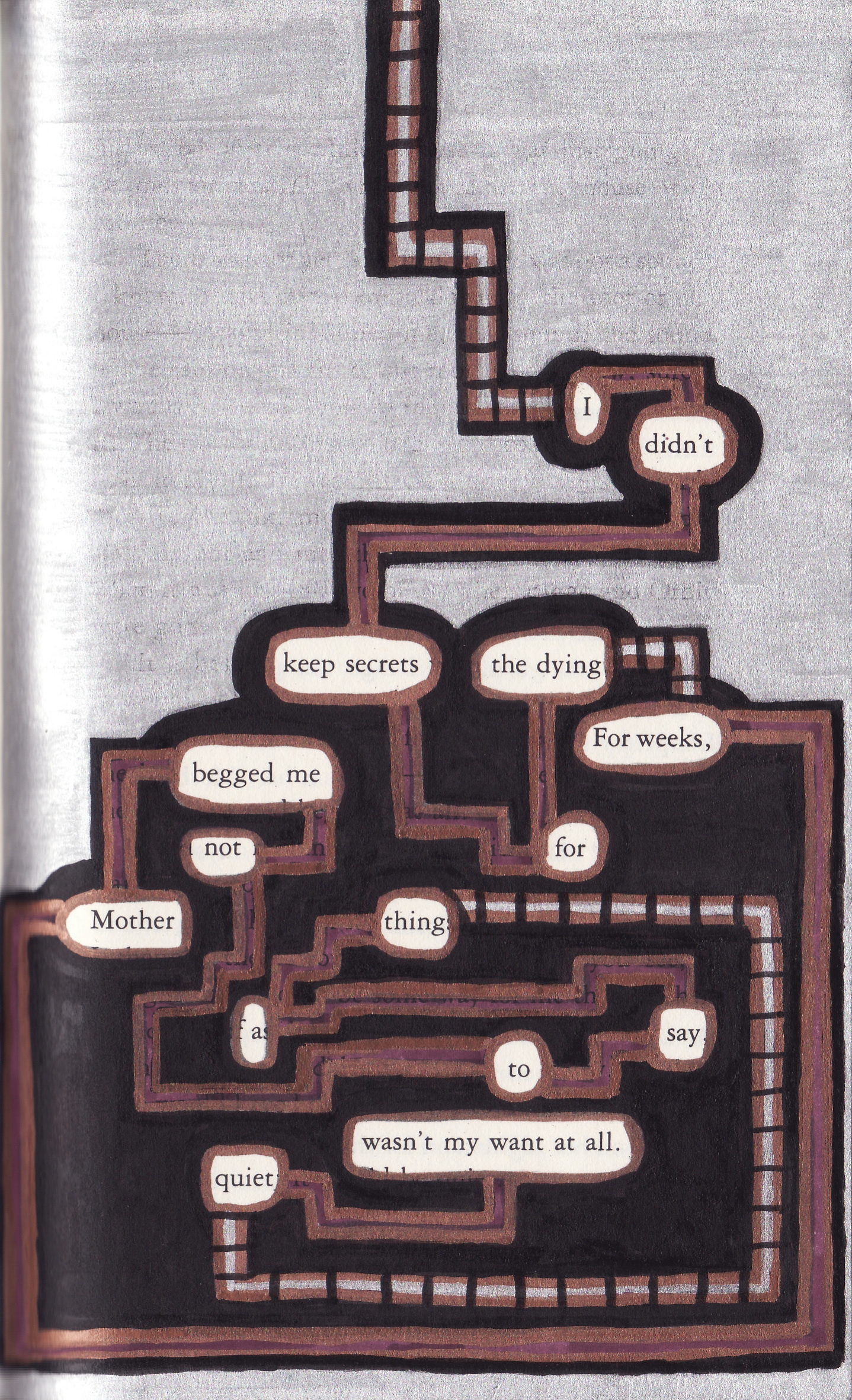 This page is a tricky one and shows that I'm trying to learn how to do altered pages as I go. If viewers only had the image to go on, then I feel like the two sentences in white could be read two ways, either: "He screamed at me, but he could not see the sun," or, "But he could not see the sun. He screamed at me."