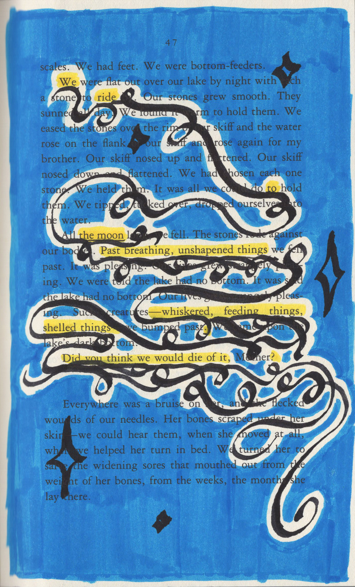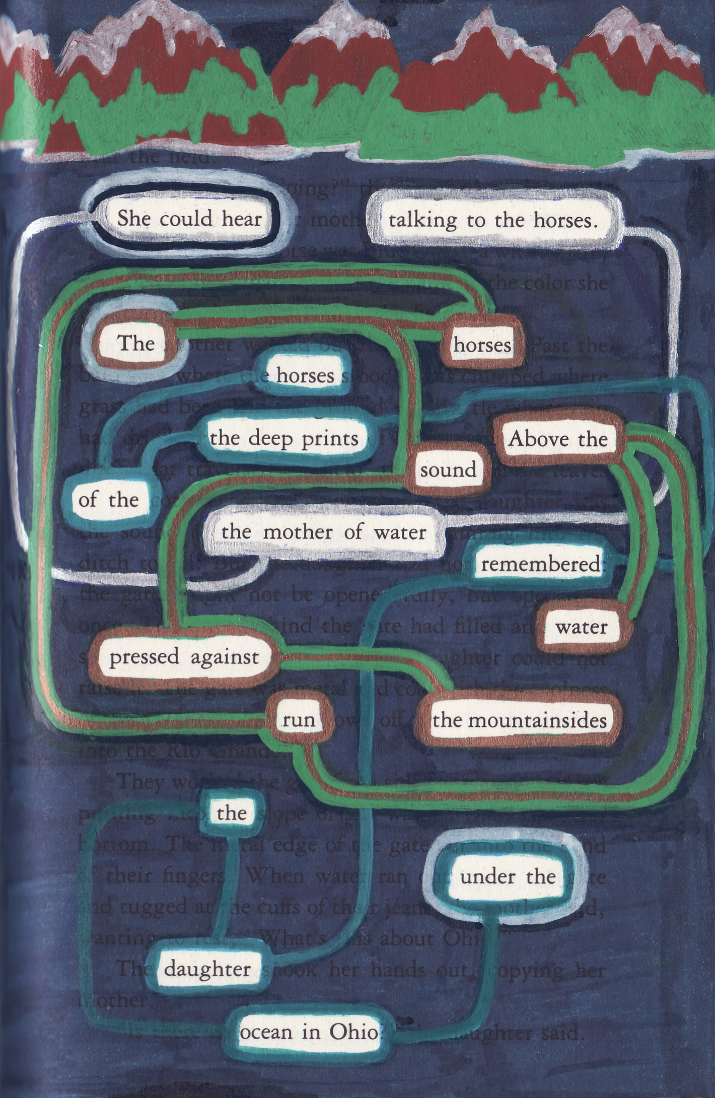 She could hear the mother of water talking to the horses. The horses run above the water. The sound pressed against the mountainsides. Under the ocean in Ohio, the daughter remembered the deep prints of the horses.