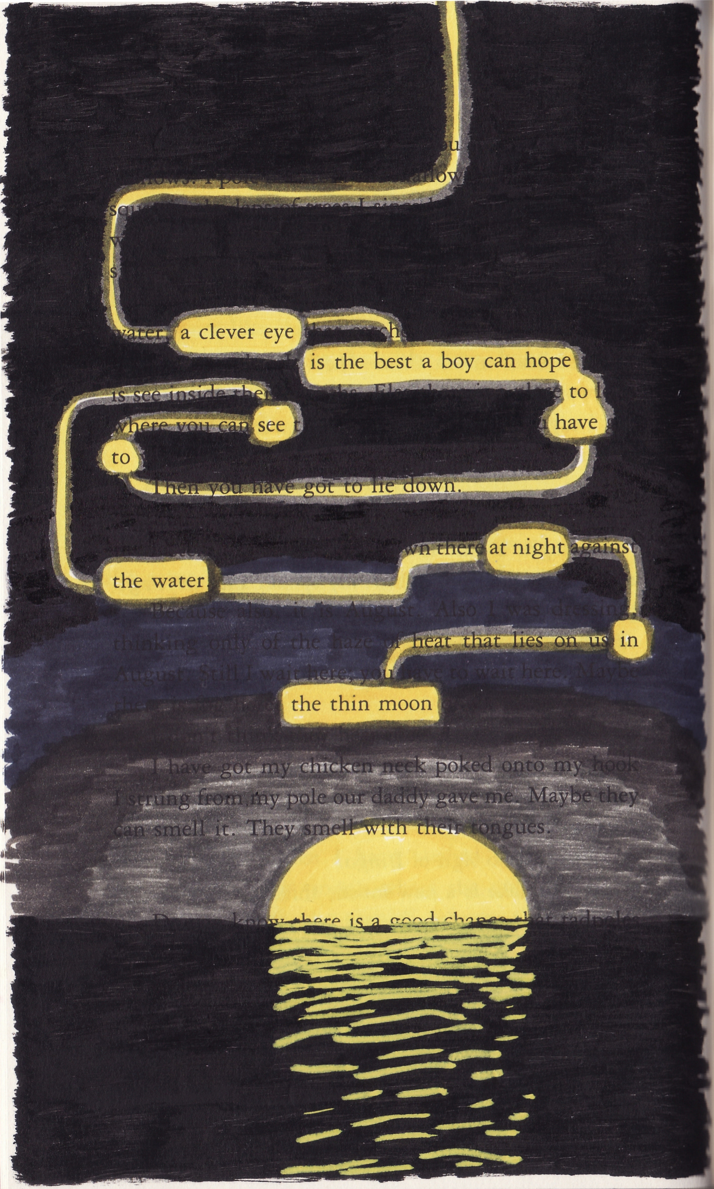 A clever eye is the best a boy can hope to have to see the water at night in the thin moon.